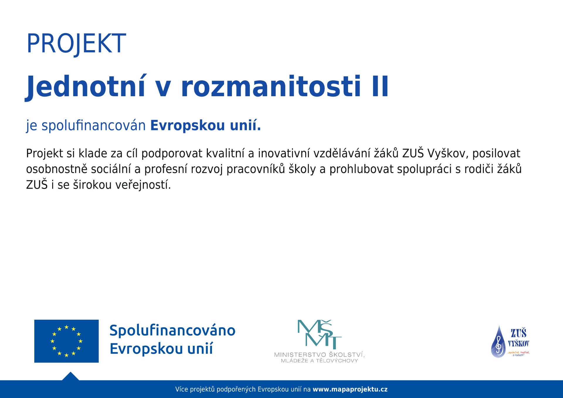 Naše škola je zapojena do Operačního programu Jan Amos Komenský. Náš projekt "Jednotní v rozmanitosti – šablony ZUŠ Vyškov 2023–2025", který je spolufinancován EU a MŠMT, přispěje ke zvýšení kvality uměleckého vzdělávání v naší škole prostřednictvím inovativních metod výuky, vzdělávání pracovníků ve vzdělávání a jejich spolupráce i rozvoje komunikace školy s rodiči i širokou veřejností.